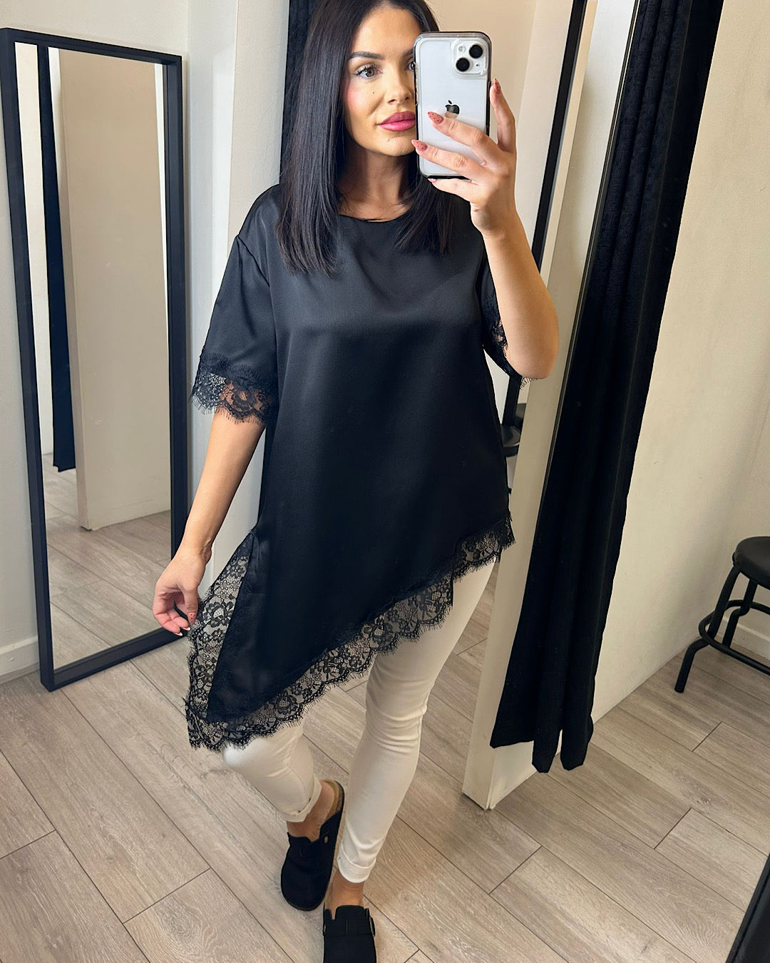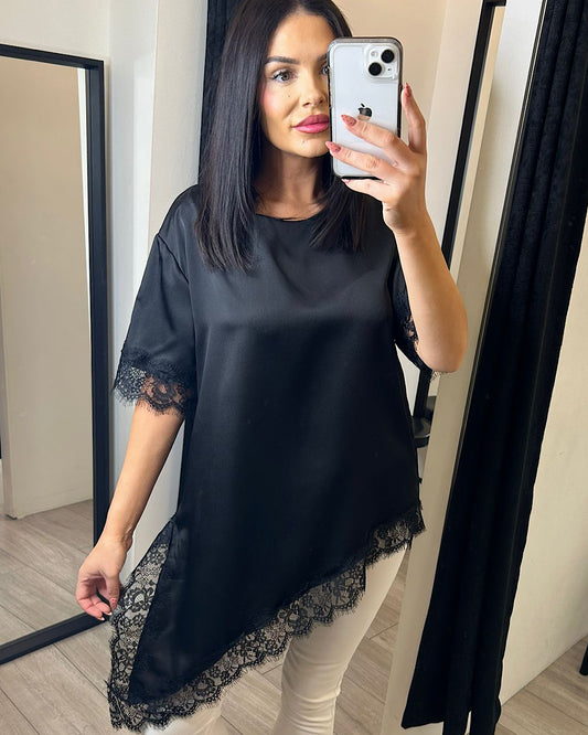 Black Satin Top with Lace Hem