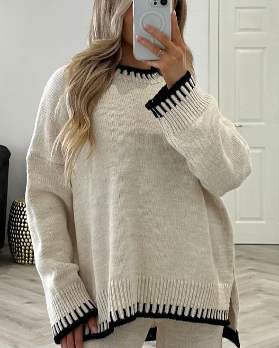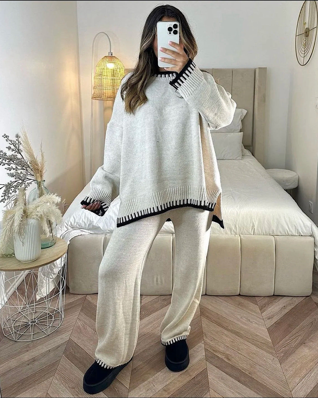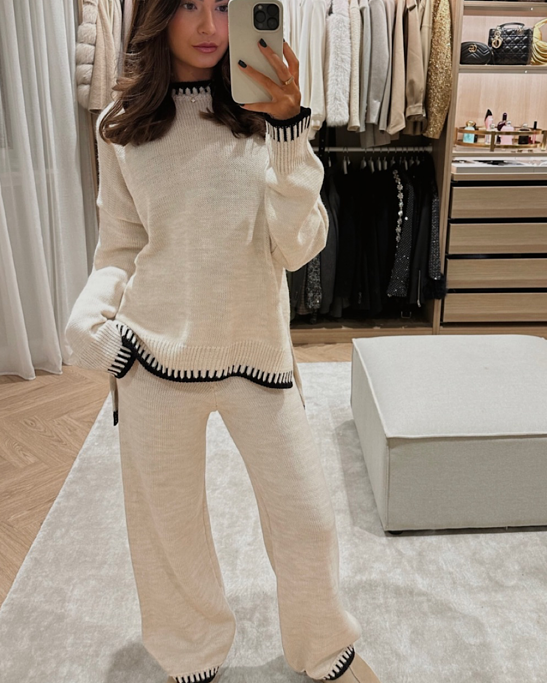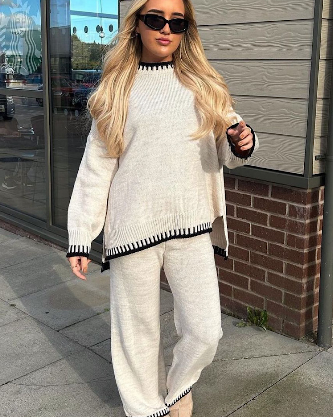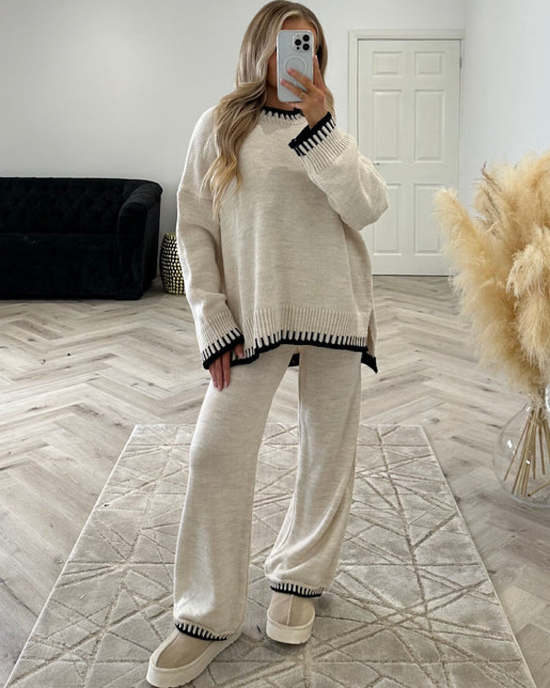 Expertly crafted with a relaxed fit, this Beige Contrast Stitch Knit Suit features an oversized knit top and wide leg knit trousers with subtle black contrast stitching. Made for comfort without compromising style, this suit is the perfect combination of fashion and functionality. Elevate any look with this versatile and chic suit.