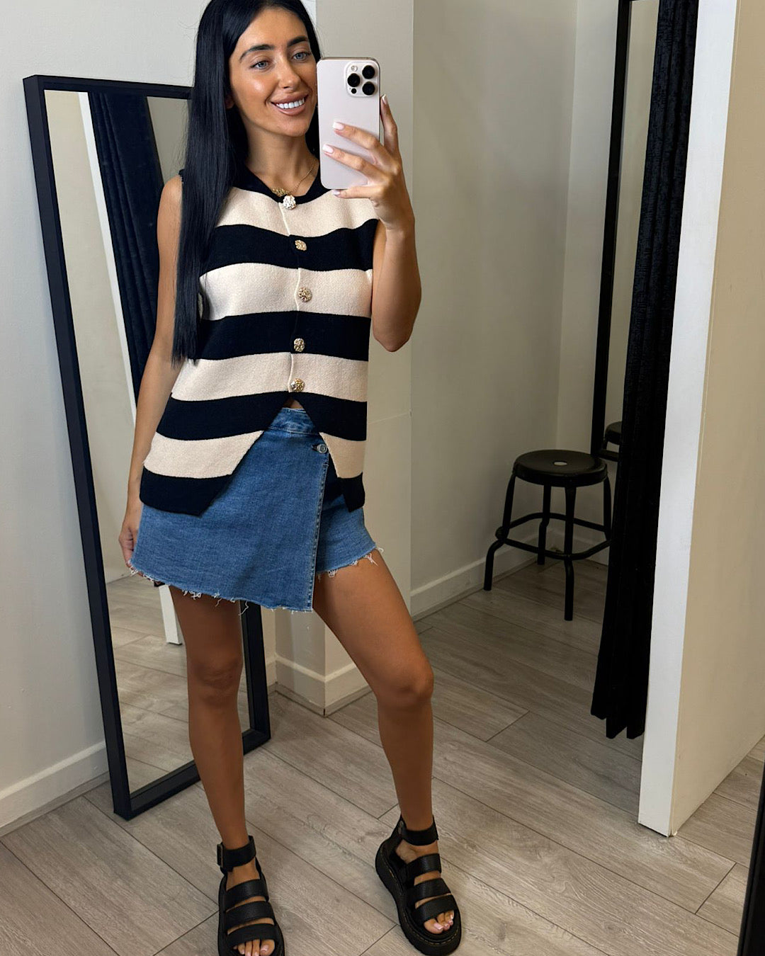 Elevate your wardrobe with our black and beige knit vest top. This sleeveless waistcoat style top features luxurious gold buttons for a touch of glamour. Perfect for any occasion, this top combines comfort and style effortlessly.