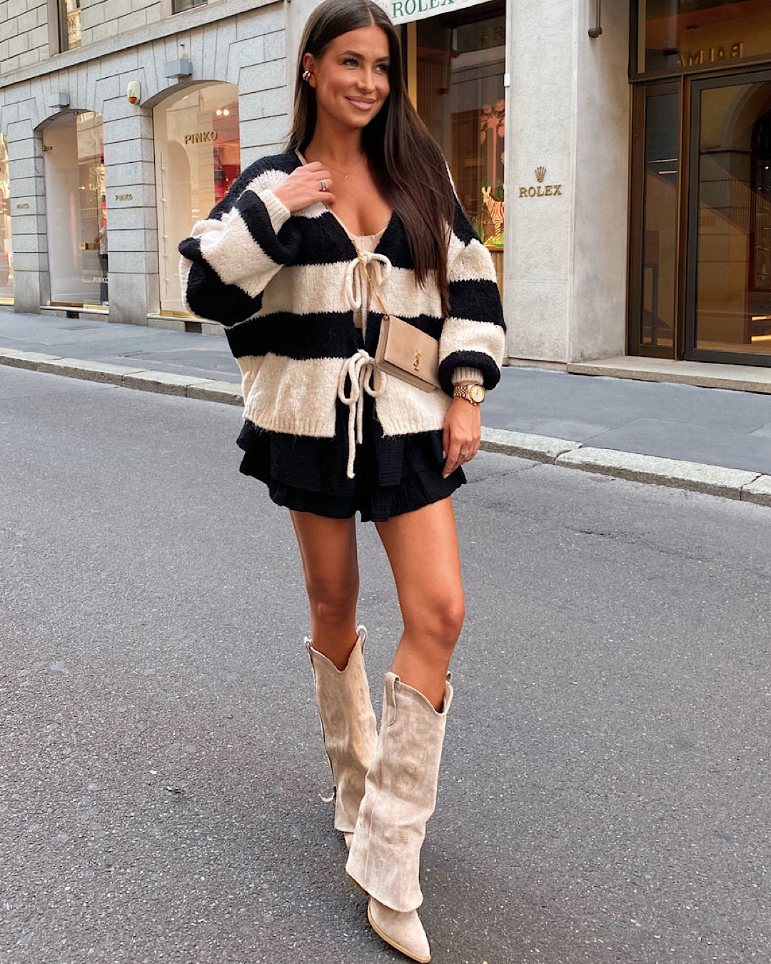 This black and cream lace front knit cardigan features long sleeves and a lace tie-up front for a sophisticated and stylish look. The stripe colour block adds a touch of elegance, while the knit material provides comfort and warmth. Perfect for any occasion, this cardigan is a must-have addition to your wardrobe.