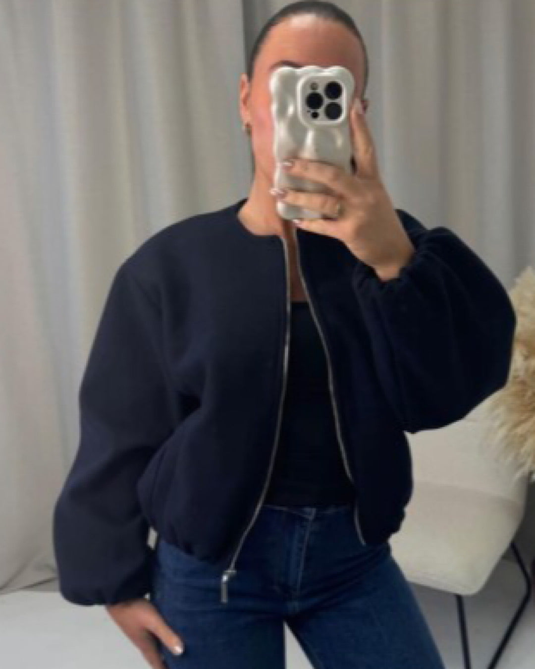 Introducing our Black Balloon Sleeve Ruched Bomber Jacket - a must-have for your wardrobe. This collarless jacket features balloon sleeves, a ruched hem, and a zip-through closure. Crafted with a wool blend, it exudes elegance and warmth. Elevate your look with its chic and versatile style.