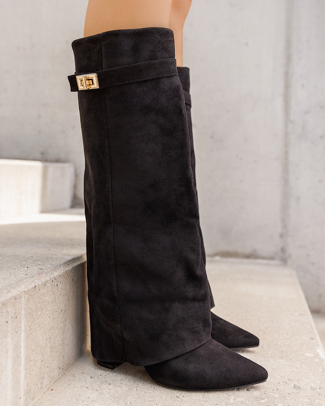 Expertly crafted from a luxurious black faux suede, these below the knee boots feature a fold over block heel and buckle for a chic and comfortable fit. Elevate your everyday look with these versatile and stylish boots.