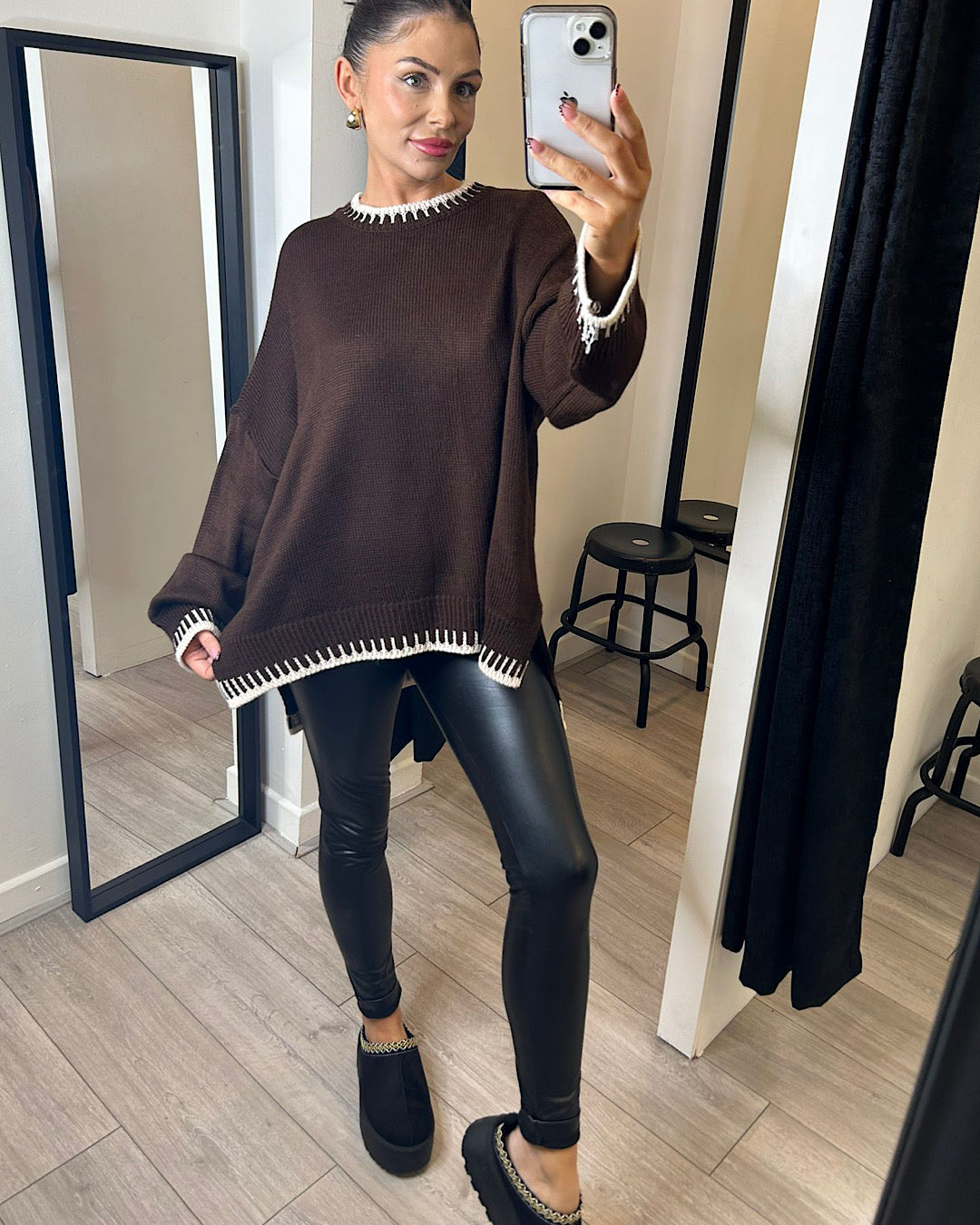 This chocolate knit top features long sleeves and a round neck, with cream stitch detail. The side split design adds a touch of style, while the high-quality knit fabric offers comfort and durability. Perfect for layering or wearing on its own, this top is a versatile addition to any wardrobe.