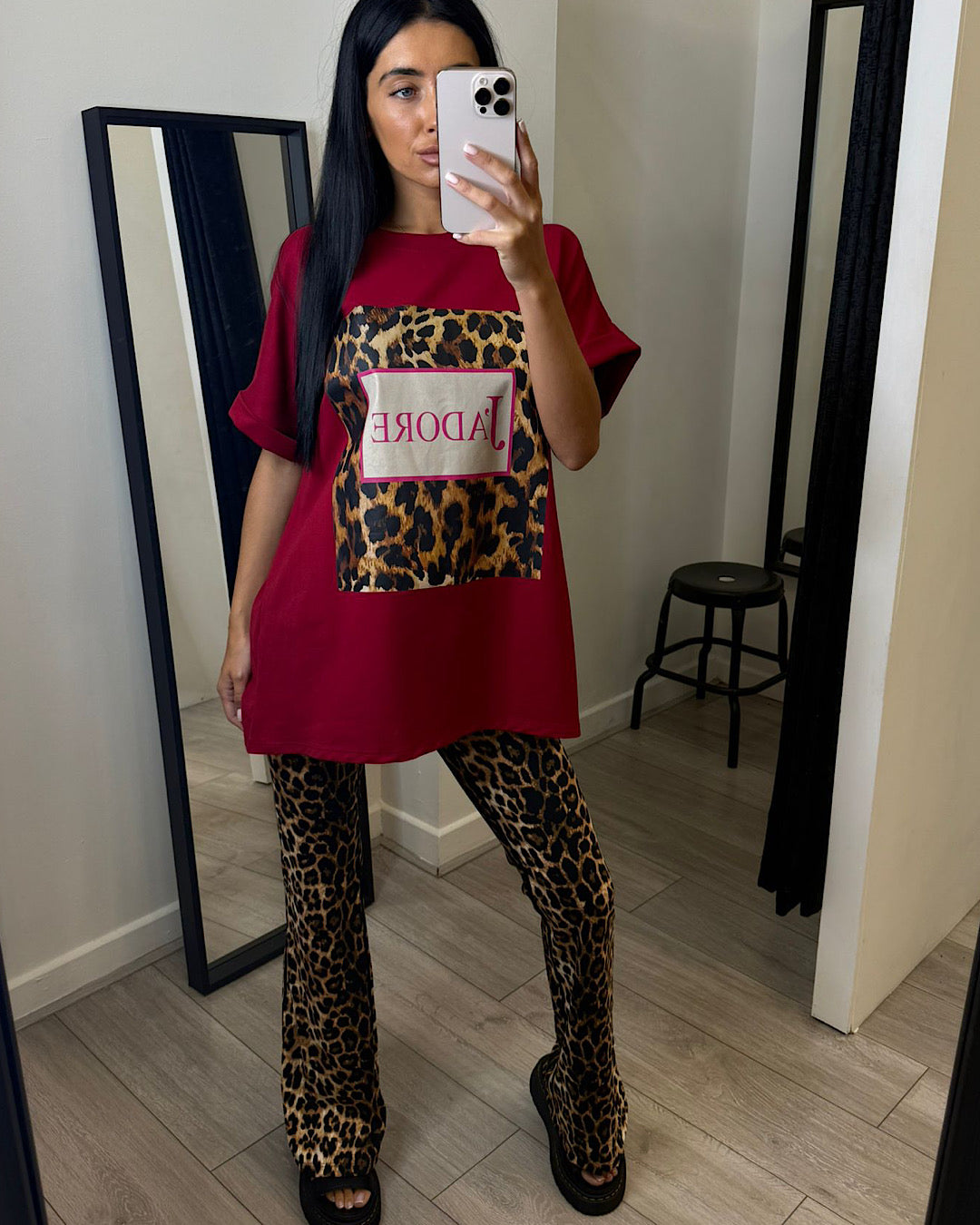 These Flared Leopard Yoga Trousers feature a high waist for comfort and support, while the ruched bum adds a flattering touch. The stylish leopard print design adds a touch of fashion to your active wear, making these yoga flares a must-have for your workout wardrobe."