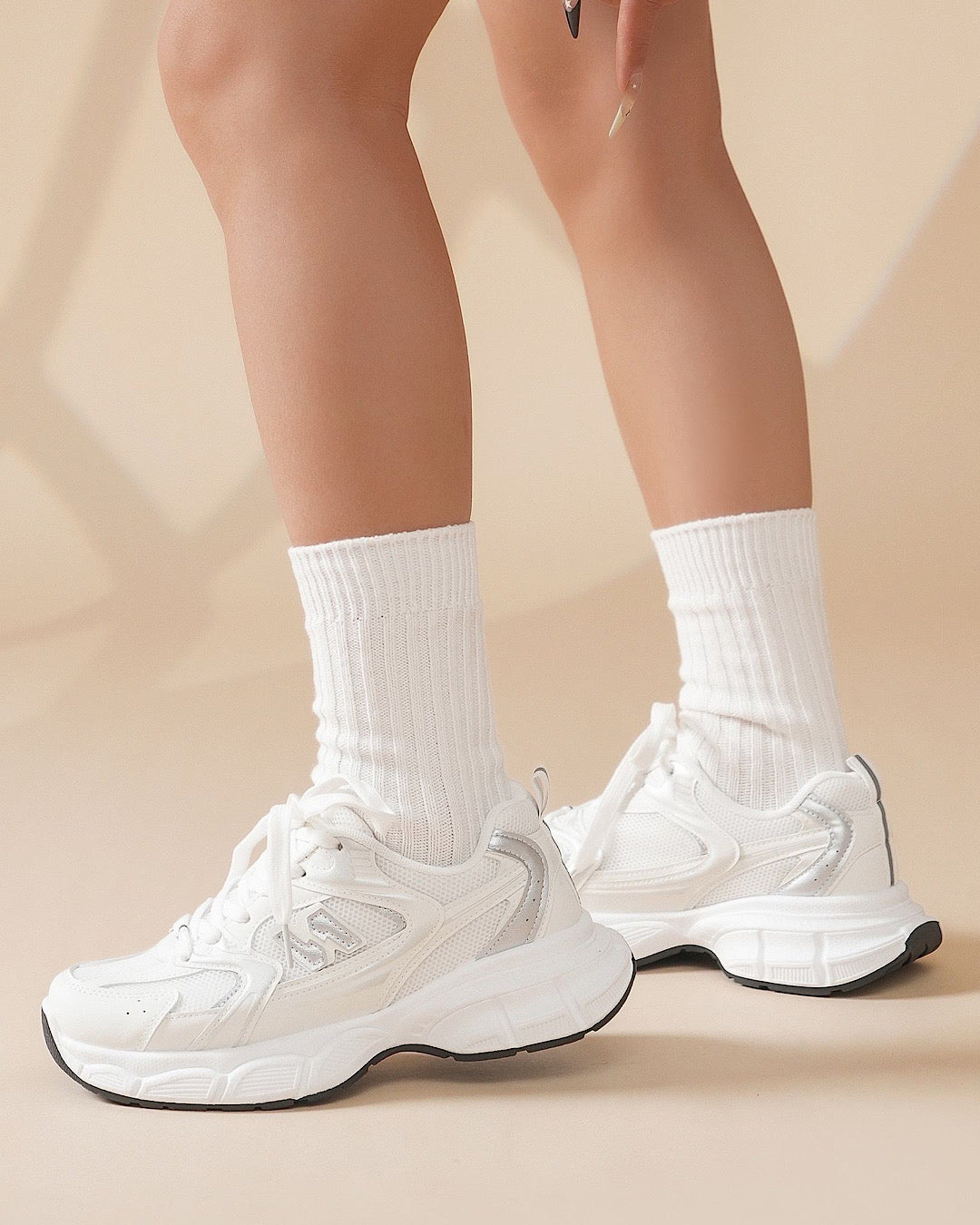 Upgrade your athletic look with our White Chunky Lace Up Trainers. Featuring a thick sole for increased durability, these trainers are perfect for any workout. The lace up fastening ensures a secure fit while the white and black design adds a touch of style. Available in sizes 3-8.
